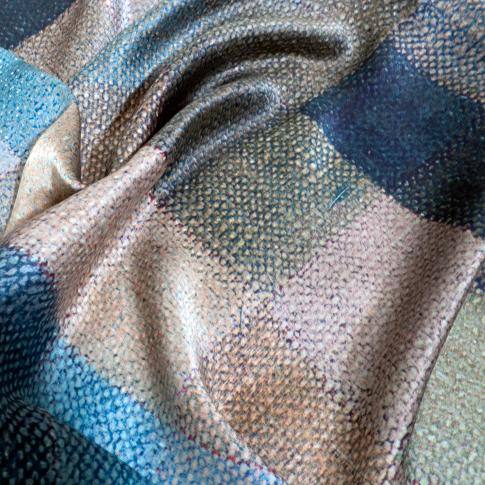 This scarf is inspired by a Freda Robertshaw work. Julia has taken the colours of Freda’s Butterfly painting and made them her own. The detail of the linen used for the painting is captured in this scarf. There is a strange disconnect between the softness of the silk and the printed effect of the linen.