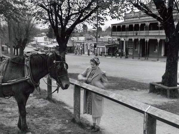 | Jim Fitzpatrick, Ethel McDonald (farmer’s wife) ties her horse in Main Street, Drouin, 1944 |