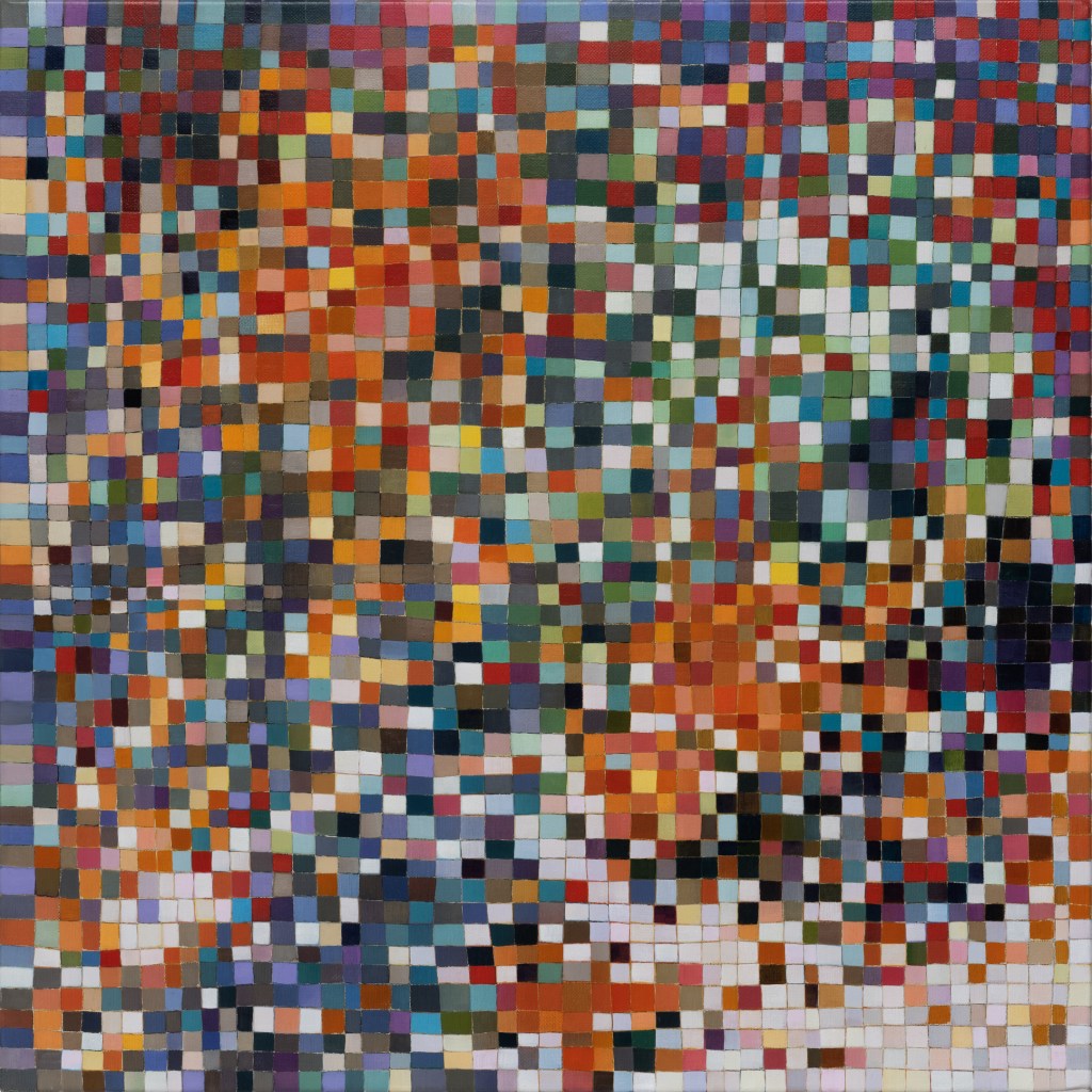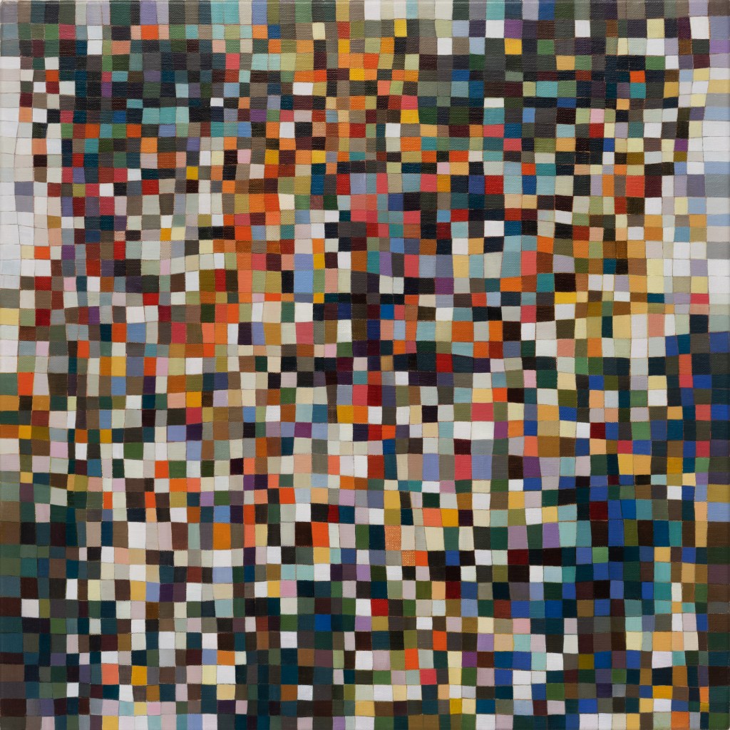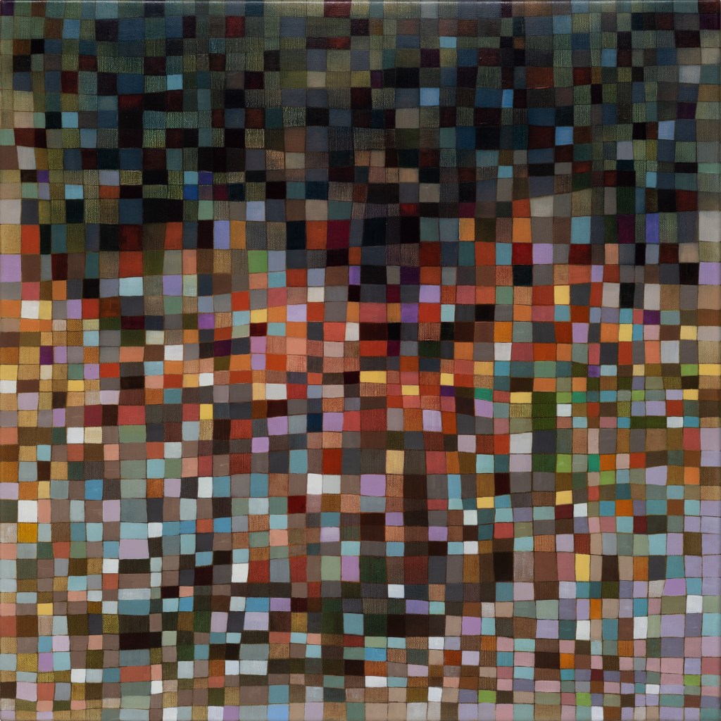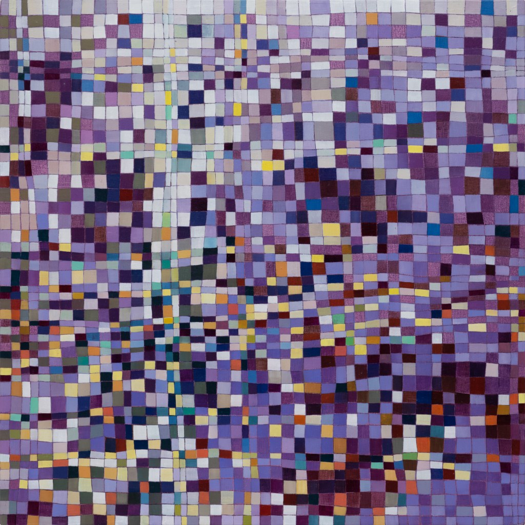 It’s hard work to look at these paintings without trying to discern hints of objects from the external world; to make nothing of them but themselves. Cursed brain, always forming connections! I try viewing them as if I were walking around with Josef Albers talking about colours presenting themselves in continuous flux, constantly related to changing neighbours and changing conditions. Truly wanting to see nothing but blocks of colour, I try hard not to see mountains, fragments of Pompeiian mosaic, a path into bush, city lights, a cottage border, some freeform Bargello needlework. I labour to suppress the fancy that the smaller units, squashed under or pressed between larger ones, squeak for more space. I try to forget the unforgettable, that ravishing sentence from Ulysses ending ‘through the checkerwork of leaves the sun flung spangles, dancing coins.’ If I remember picking up handfuls of smalti in a mosaicist’s workshop and watching them fall in brilliant drops through my fingers, or if I seem to feel the coolness of our bathroom floor as I lay on it when a child, it feels vulgar to say so. Mondrian’s Neo-Plasticism points, at least, to the dignity and gravity of the strongest abstract paintings, even tiny ones like Ritson’s. Quiet and limpid contemplation is their due, not a scramble to assimilate them into the personal history of the observer.