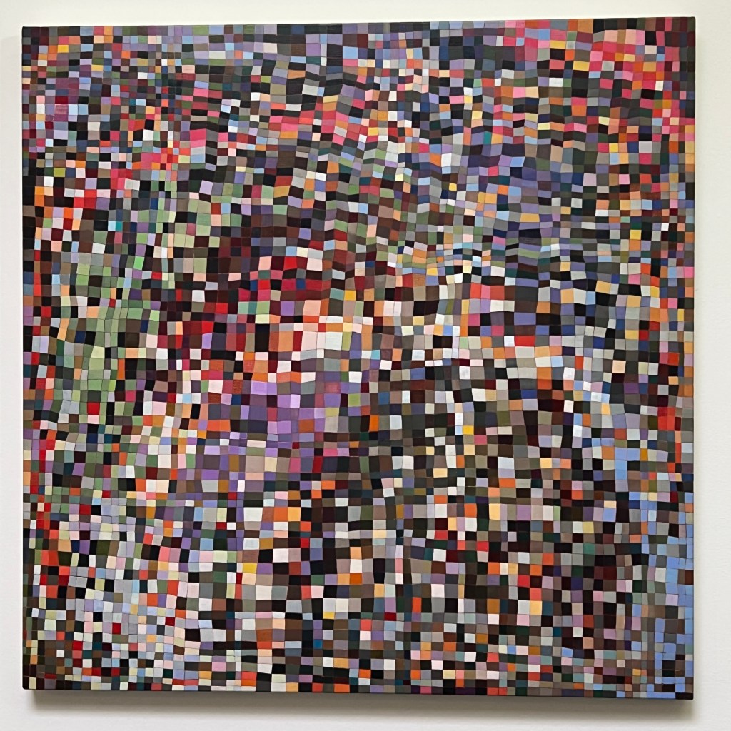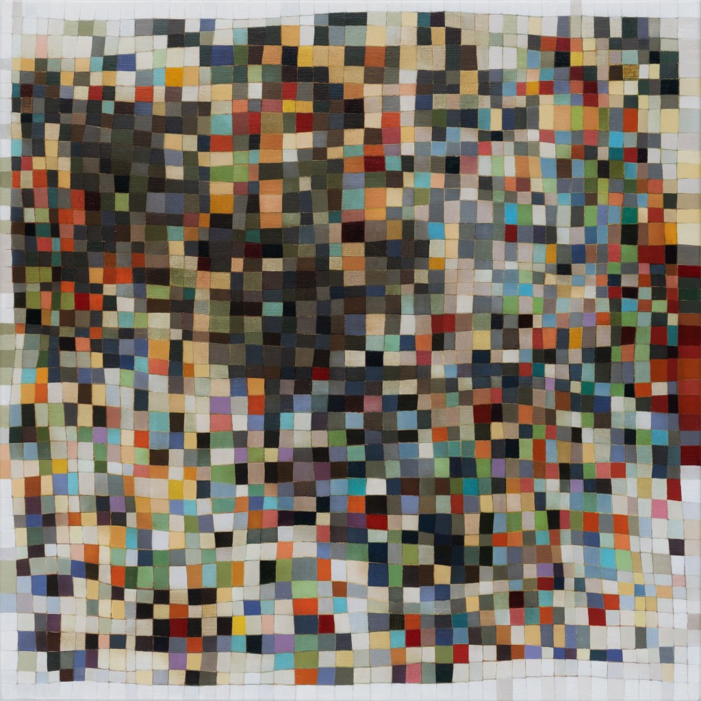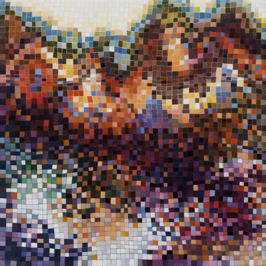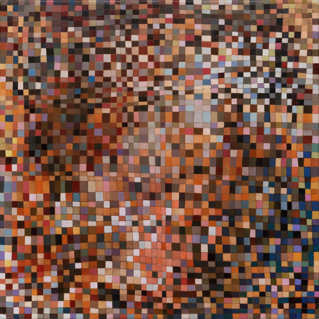 It’s hard work to look at these paintings without trying to discern hints of objects from the external world; to make nothing of them but themselves. Cursed brain, always forming connections! I try viewing them as if I were walking around with Josef Albers talking about colours presenting themselves in continuous flux, constantly related to changing neighbours and changing conditions. Truly wanting to see nothing but blocks of colour, I try hard not to see mountains, fragments of Pompeiian mosaic, a path into bush, city lights, a cottage border, some freeform Bargello needlework. I labour to suppress the fancy that the smaller units, squashed under or pressed between larger ones, squeak for more space. I try to forget the unforgettable, that ravishing sentence from Ulysses ending ‘through the checkerwork of leaves the sun flung spangles, dancing coins.’ If I remember picking up handfuls of smalti in a mosaicist’s workshop and watching them fall in brilliant drops through my fingers, or if I seem to feel the coolness of our bathroom floor as I lay on it when a child, it feels vulgar to say so. Mondrian’s Neo-Plasticism points, at least, to the dignity and gravity of the strongest abstract paintings, even tiny ones like Ritson’s. Quiet and limpid contemplation is their due, not a scramble to assimilate them into the personal history of the observer.