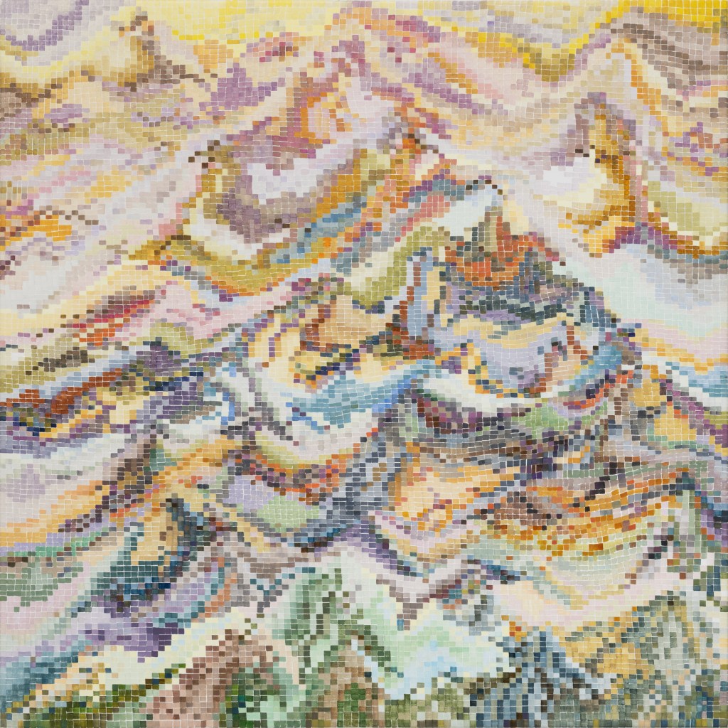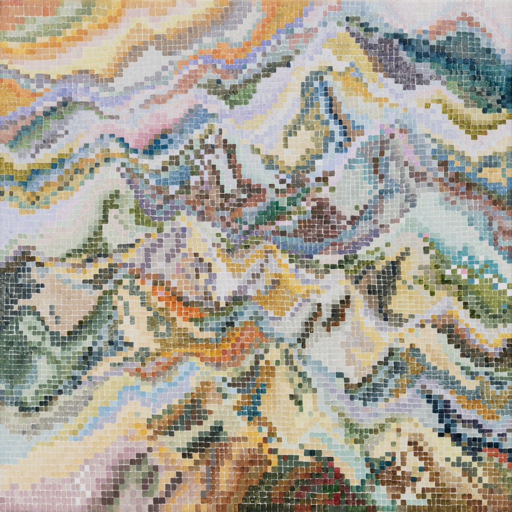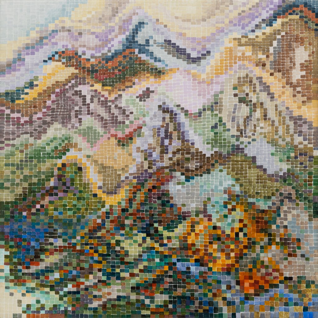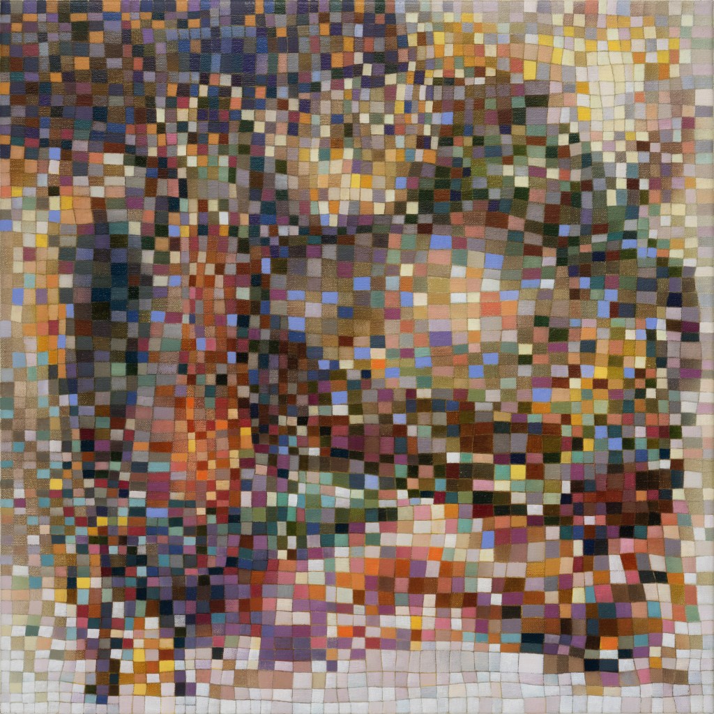 It’s hard work to look at these paintings without trying to discern hints of objects from the external world; to make nothing of them but themselves. Cursed brain, always forming connections! I try viewing them as if I were walking around with Josef Albers talking about colours presenting themselves in continuous flux, constantly related to changing neighbours and changing conditions. Truly wanting to see nothing but blocks of colour, I try hard not to see mountains, fragments of Pompeiian mosaic, a path into bush, city lights, a cottage border, some freeform Bargello needlework. I labour to suppress the fancy that the smaller units, squashed under or pressed between larger ones, squeak for more space. I try to forget the unforgettable, that ravishing sentence from Ulysses ending ‘through the checkerwork of leaves the sun flung spangles, dancing coins.’ If I remember picking up handfuls of smalti in a mosaicist’s workshop and watching them fall in brilliant drops through my fingers, or if I seem to feel the coolness of our bathroom floor as I lay on it when a child, it feels vulgar to say so. Mondrian’s Neo-Plasticism points, at least, to the dignity and gravity of the strongest abstract paintings, even tiny ones like Ritson’s. Quiet and limpid contemplation is their due, not a scramble to assimilate them into the personal history of the observer.